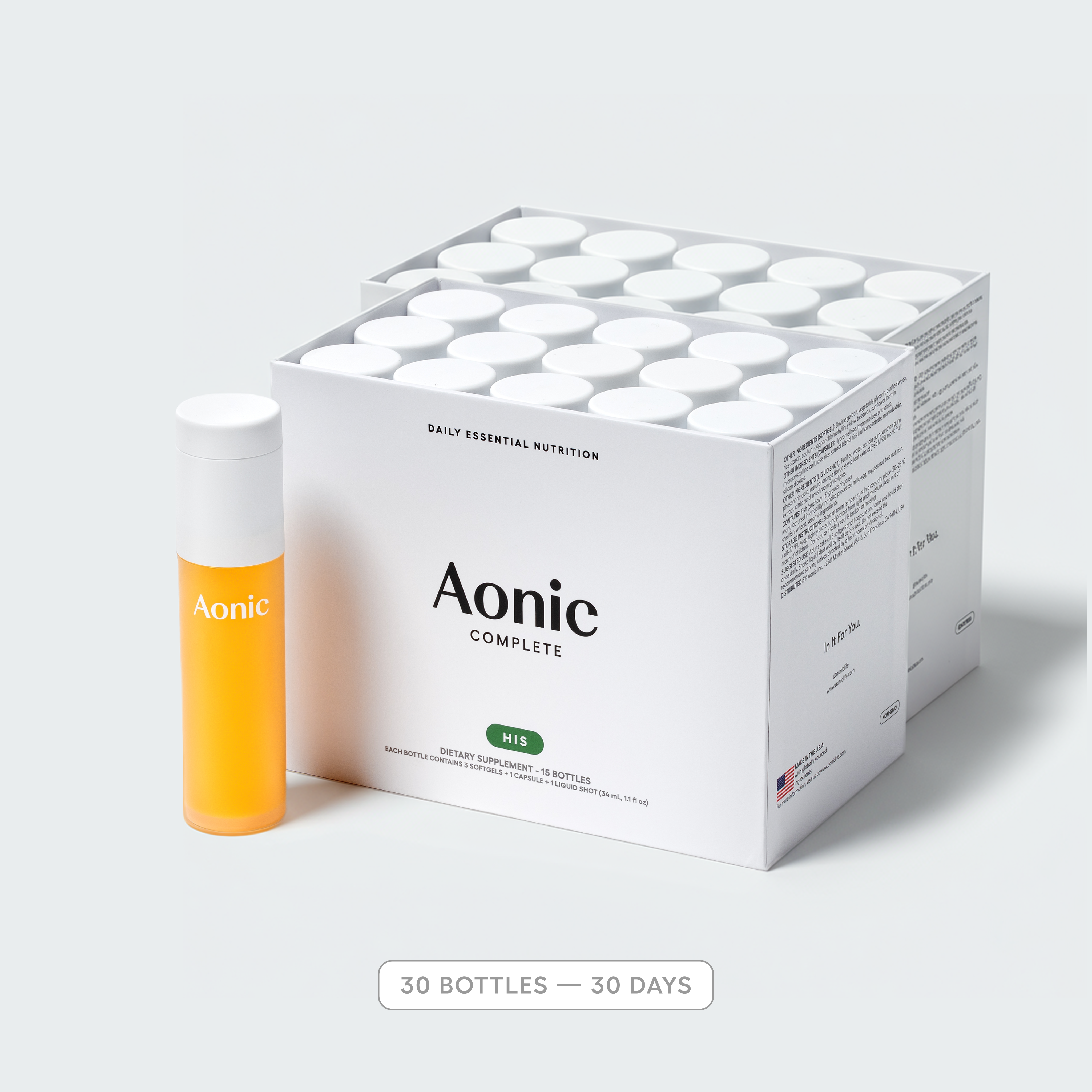 Aonic Complete is an all-in-one daily ritual that simplifies your supplement routine. Each kit delivers 34 essential nutrients in clinically effective dosages—including vitamins, minerals, and functional compounds—all in one simple daily routine. Designed for HIM and HER, it covers the 4 cornerstones of supplementation to support whole-body health: