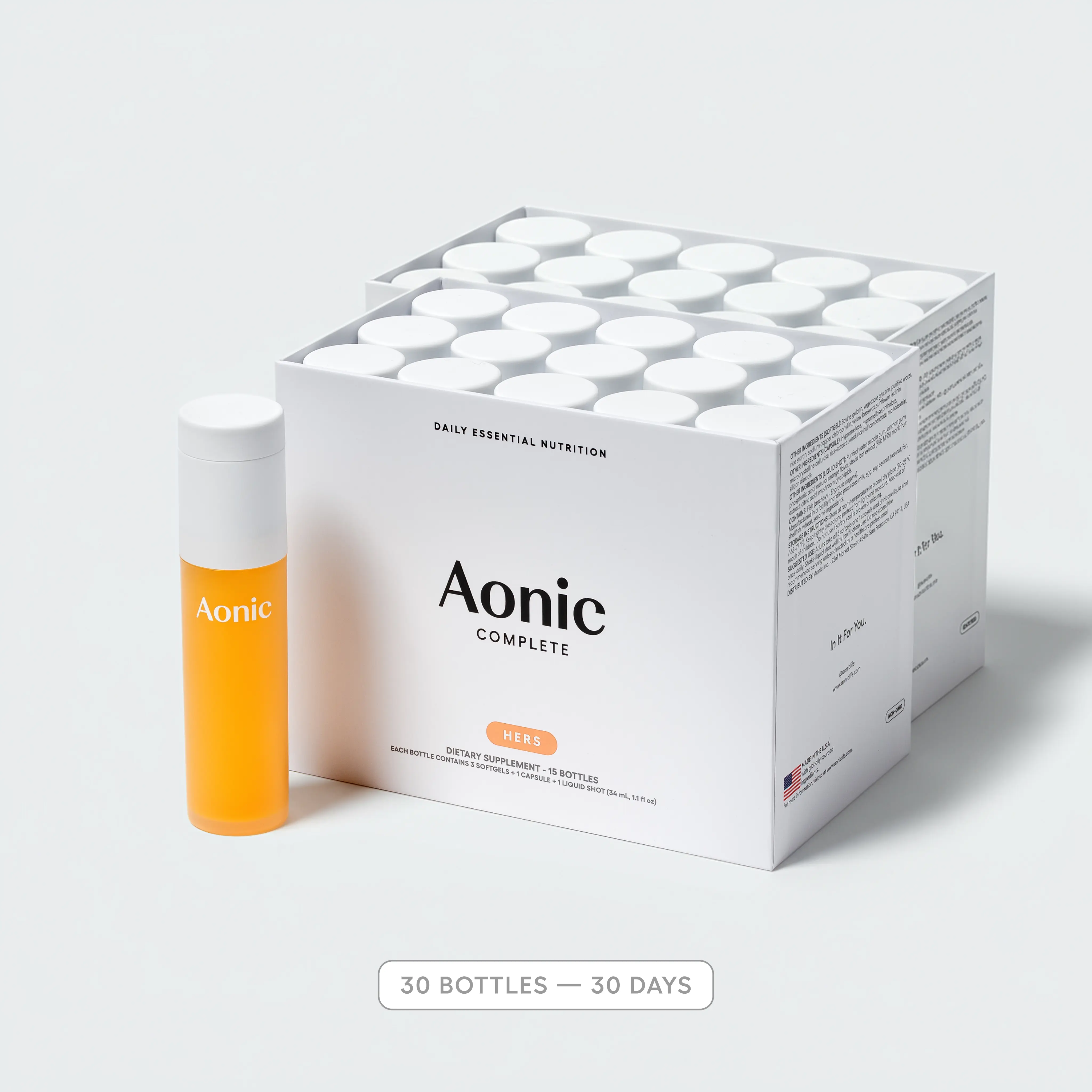 Aonic Complete is an all-in-one daily ritual that simplifies your supplement routine. Each kit combines 34 nutrients at clinically studied dosages, minerals, and functional compounds, in one simple daily routine. In tailored HIS and HERS versions, it covers the 4 cornerstones of supplementation to support whole body health.*: